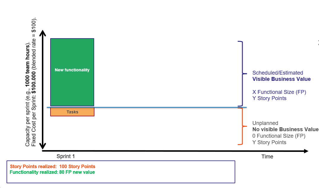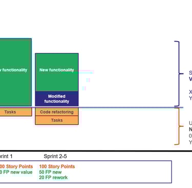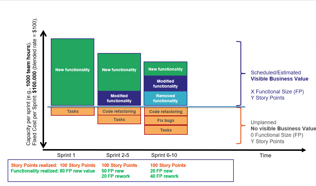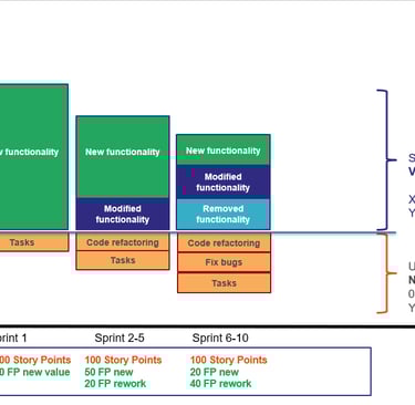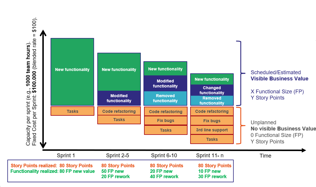 If we consider modified and removed functionality also as (reworked)value, the functional size delivered has gone down from 80 to 70 (50 FP new, 20 FP modified). Note that the team is still spending 1.000 effort hours per sprint, which costs about $100.000 per sprint, but they simply spent some more time on activities that don’t bring visible value.