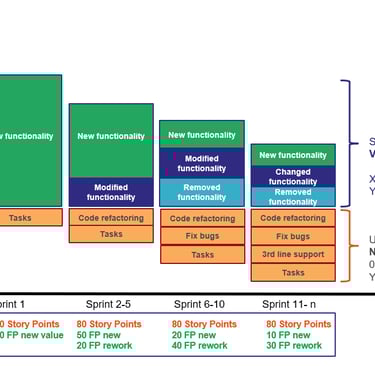 That's why serious organizations increasingly track functional size alongside story points. Functional size counts only the net business functionality added, modified, or removed that the end-user or business actually experiences — ignoring all the invisible "keeping the lights on" work.